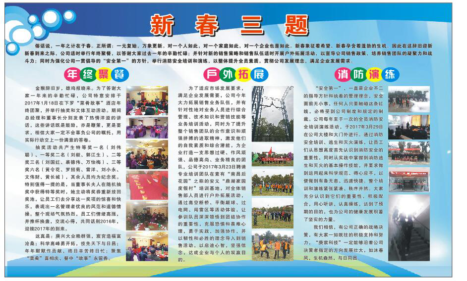 俗话说,一年之计在于春。正所谓:一元复始,万象更新。对一个人如此,对一个家庭如此,对一个企业也是如此。新春象征着希望,新春孕含着蓬勃的生机。因此在这辞旧迎新新春到来之际,公司适时举行年终聚餐,以答谢大家过去一年的辛勤忙碌;并针对新的销售策略和销售队伍适时开展户外拓展活动,以宣导公司销售政策,培养销售团队的凝聚力和战斗力;同时为强化公司一贯倡导的“安全第一”的方针,举行消防安全培训和演练,以整体提升全员素质,贯彻公司发展理念,满足企业发展需求。